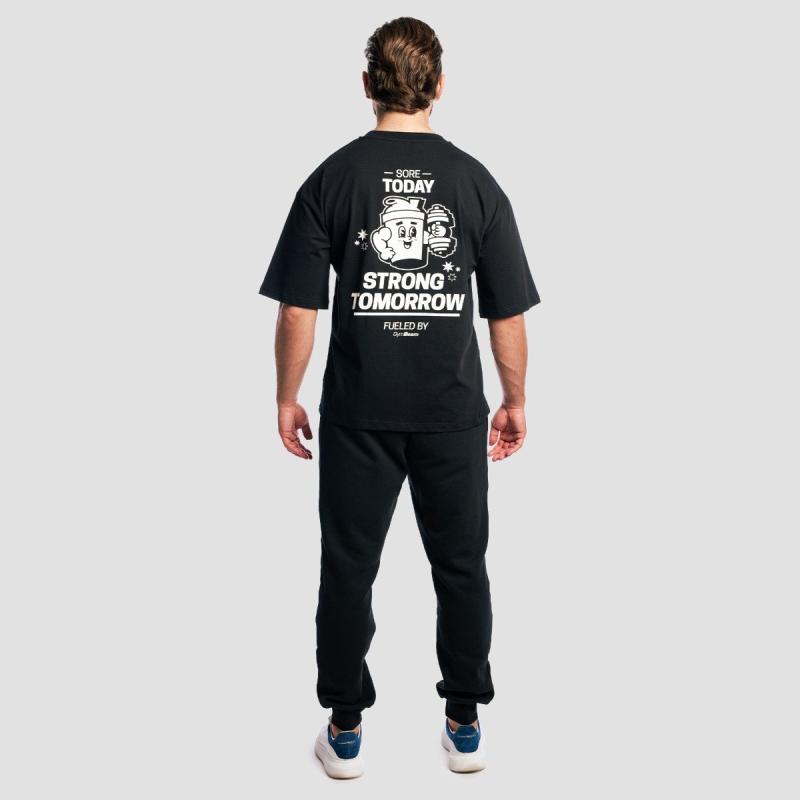 Toto pánske tričko sa vyznačuje trendy boxy oversized strihom, ktorý charakterizuje širšia silueta a spadnuté ramená pre maximálne pohodlie a štýl. Zpredu ho zdobí len malá potlač hravého šejkra. Výraznejšia je zadná časť s veľkou retro potlačou a motívom "SORE TODAY, STRONG TOMORROW", ktorý vám bude neustále pripomínať, prečo na sebe makáte.