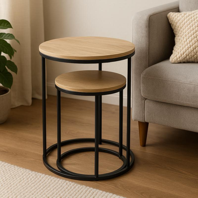 Sada dvou odkládacích stolků s pevnou železnou konstrukcí a MDF deskou v přírodní barvě nabízí praktický a stylový doplněk do interiéru. Zobrazit celý popis