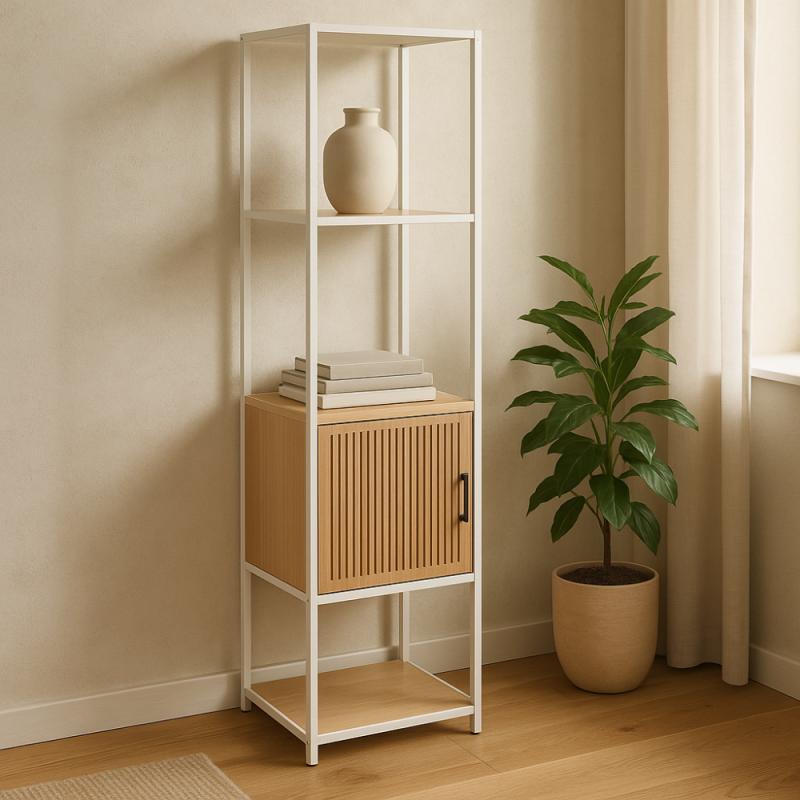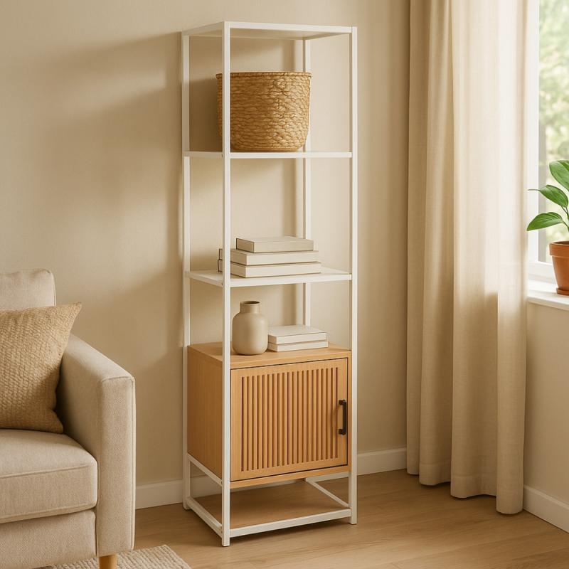 Praktický regál s bílým kovovým rámem a 5 úložnými vrstvami z MDF dýhy nabízí dostatek místa pro vaše věci v moderním designu.Regál s policemi a skříňkou v moderním industriálním stylu