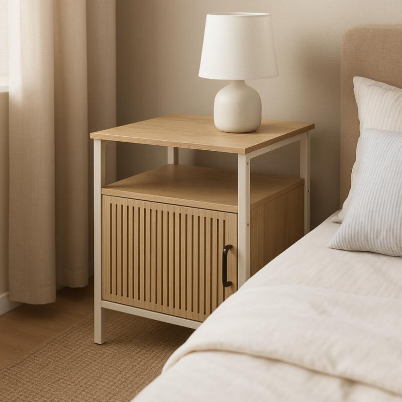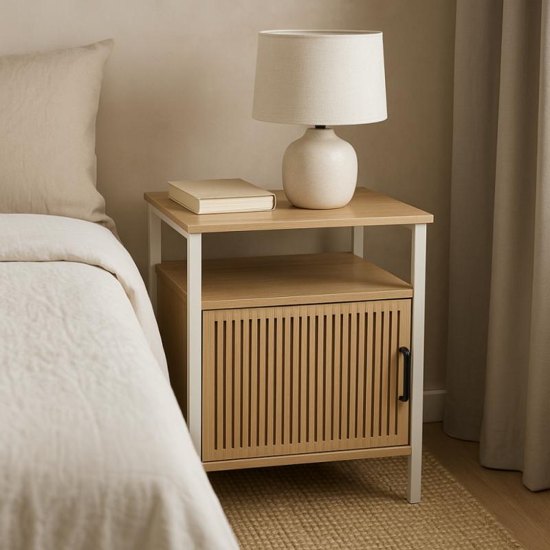 Tento noční stolek je vhodný pro uložení drobných předmětů, které chcete mít vždy po ruce, a přitom mít pořádek v prostoru. Kombinace barev a materiálů vytváří jemný a současný design, který nenaruší vzhled místnosti, ale naopak jej příjemně doplní.