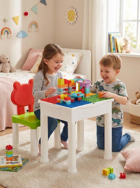 Oboustranný stůl: Jedna strana pro kreativní stavění s kostičkami, druhá pro kreslení a malování. Ať už se vaše dítě cítí jako malý architekt nebo umělec, tento stůl mu poskytne prostor pro obojí.