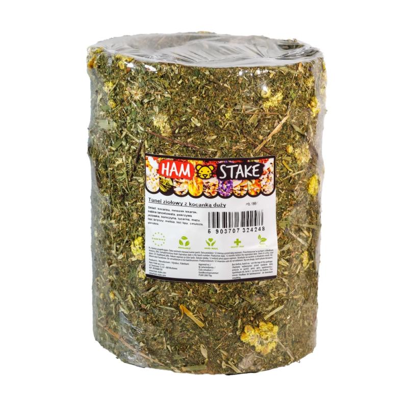Bylinková přírodní pochoutka pro hlodavce ve tvaru tunelu na roli se smilkou.