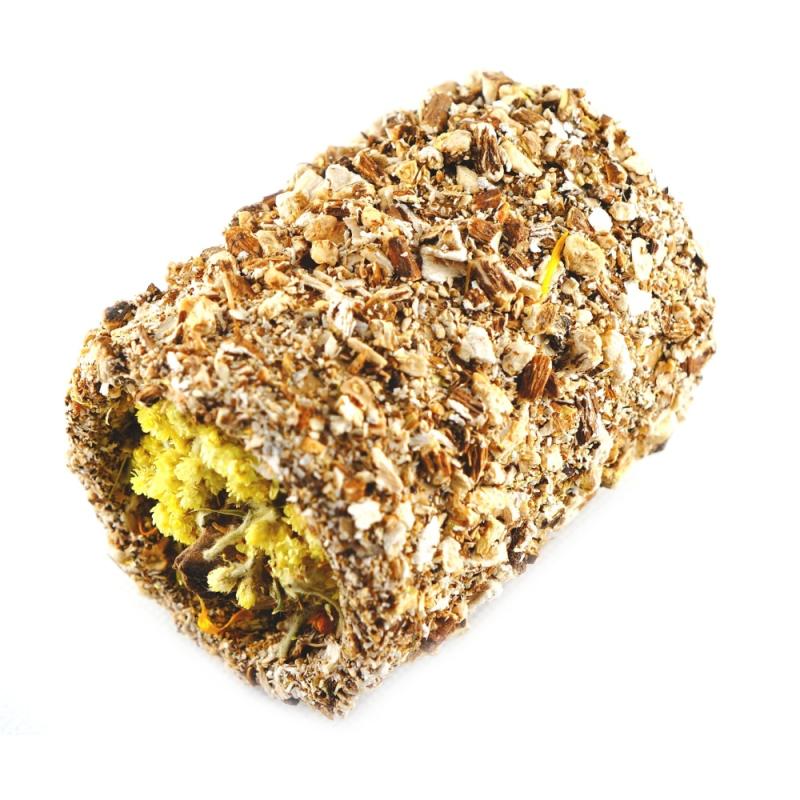 Bylinková bezobilná přírodní pochoutka pro hlodavce ve tvaru tunelu na roli s kořenem pampelišky, topinamburem a slaměnkou.Atraktivní a přírodní pamlsek, který doplňuje každodenní stravu hlodavců.