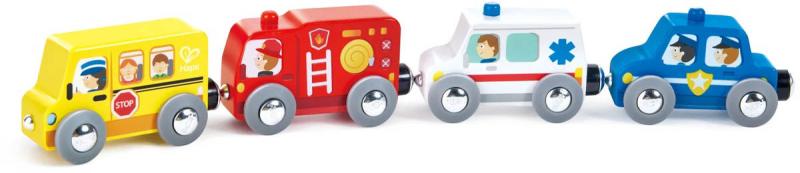Hape DŘEVO Vláček městská vozidla baby set 4 autíčka