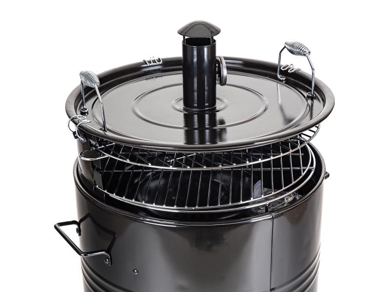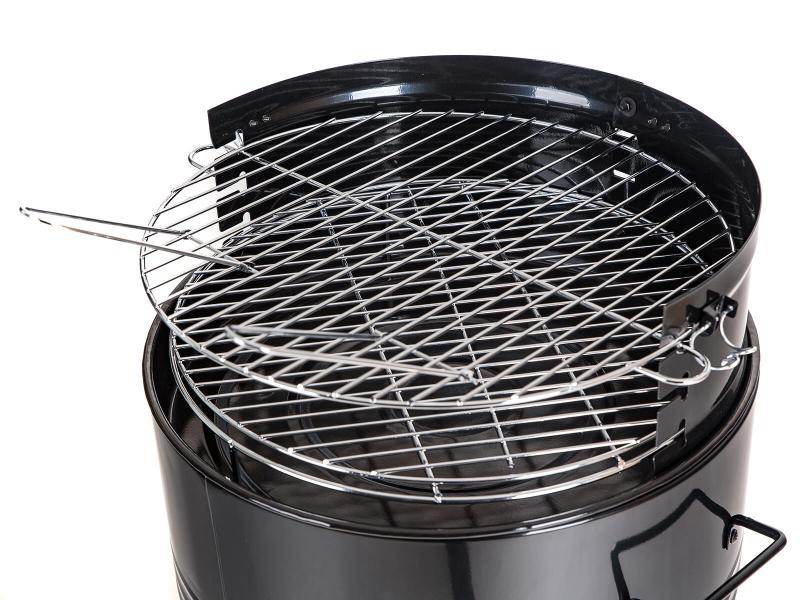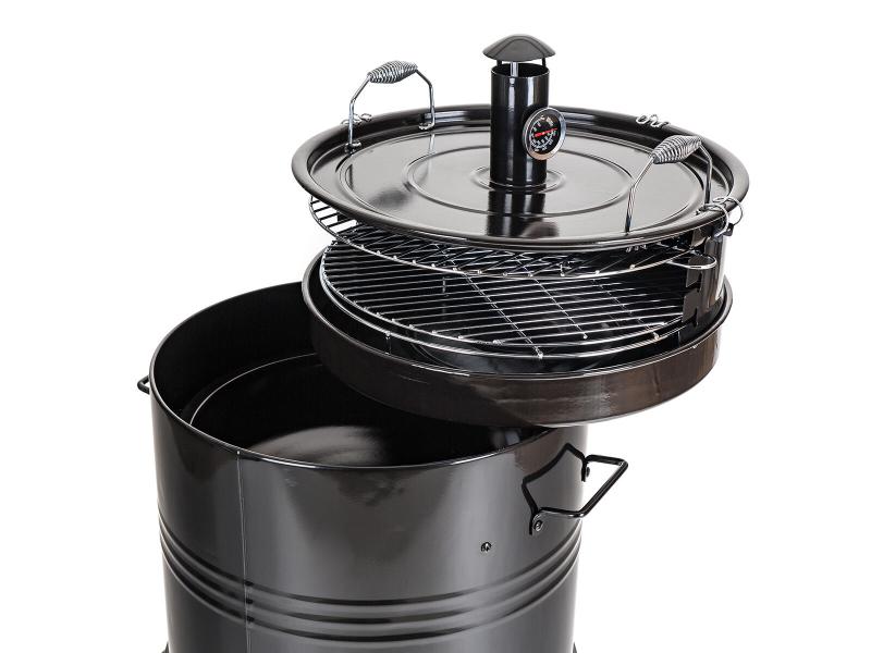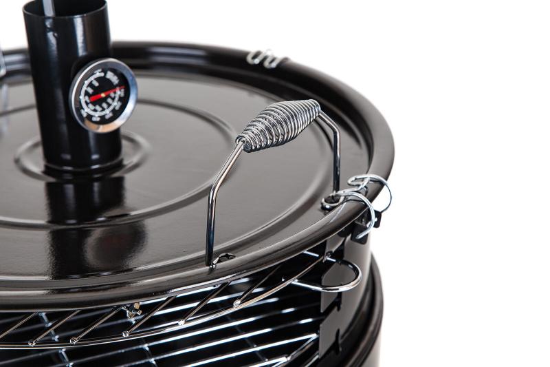 Ocelová konstrukce zajišťuje pevnost a stabilitu, přičemž černá barva dodává grilu elegantní vzhled. Díky variabilitě použití je vhodný pro různé způsoby venkovního vaření, ať už preferujete uzení, grilování nebo pečení pizzy. Vestavěný teploměr a komínek pomáhají udržet optimální podmínky během přípravy, což ocení každý, kdo chce mít pokrm pod kontrolou.