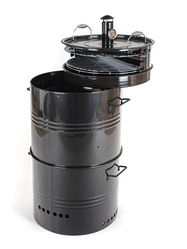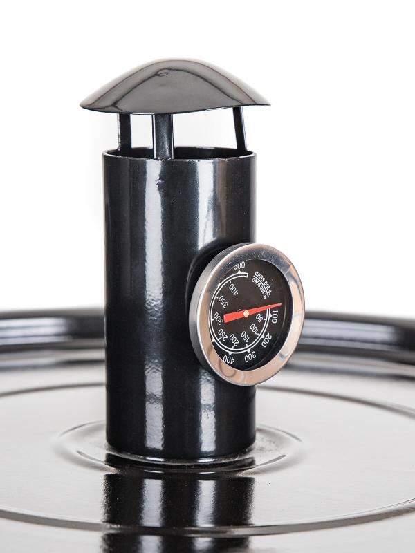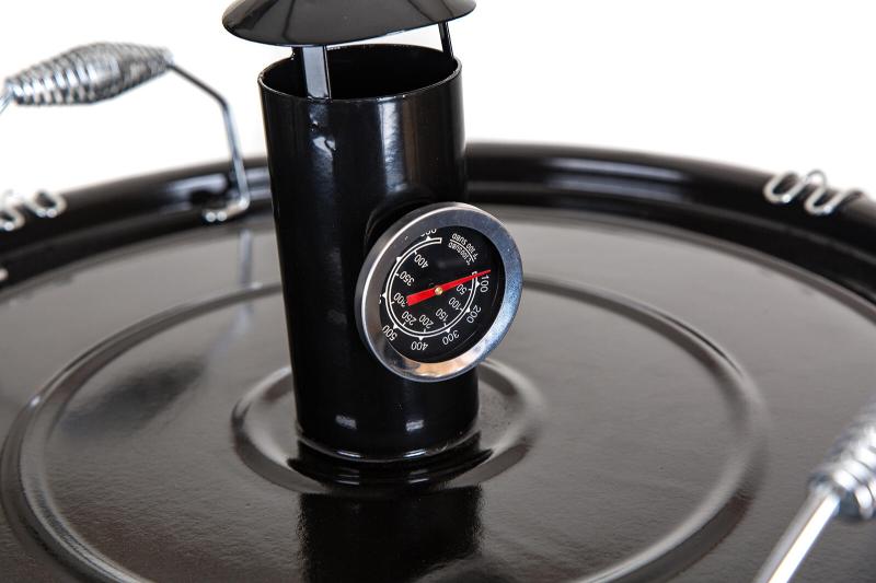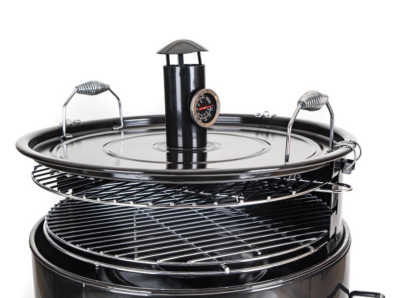 Multifunkční gril s průměrem roštu 42,5 cm nabízí možnost uzení, grilování nad vodní lázní i přeměnu na pizzu pec. Ocelová konstrukce s teploměrem a komínkem pro lepší tah.