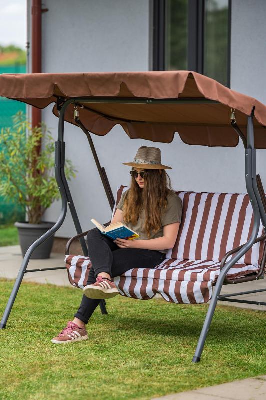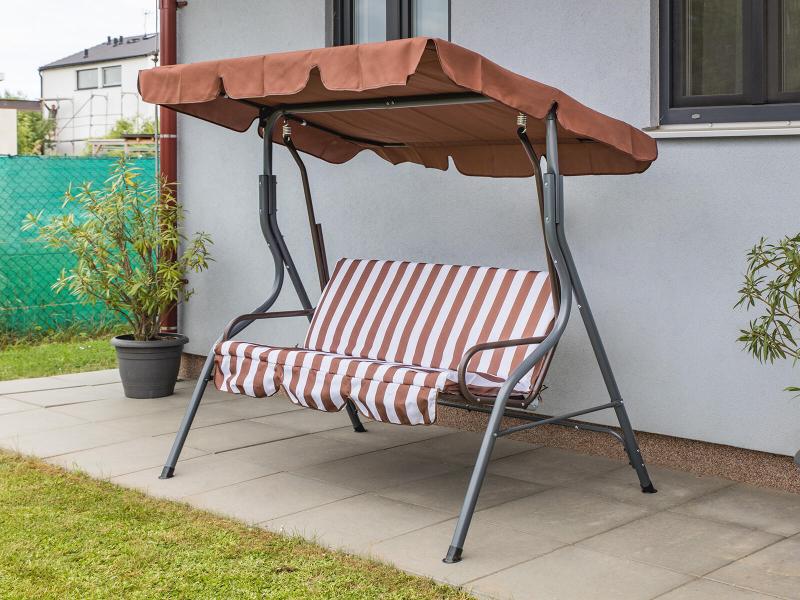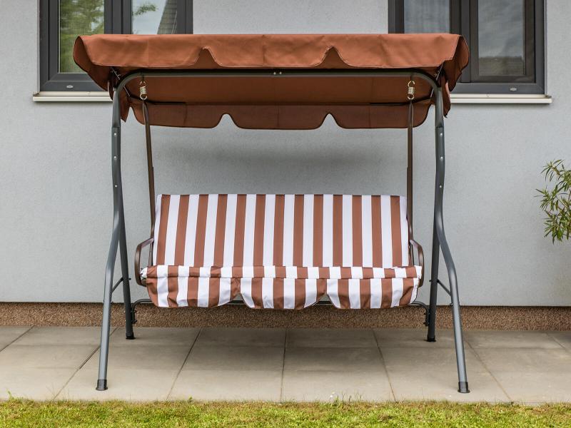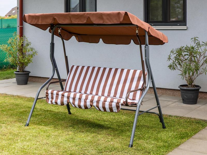 Zahradní houpačka pro tři osoby s kovovou konstrukcí a pohodlným polyesterovým sedákem o výšce 6 cm, nosnost 220 kg.