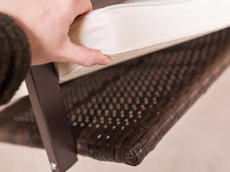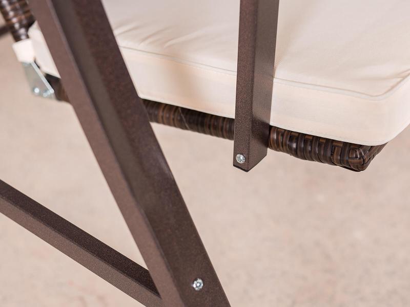 Tato zahradní houpačka je vyrobena z odolného umělého ratanu, který zajišťuje dlouhou životnost a snadnou údržbu. Kovová konstrukce je ošetřena práškovým lakováním v hnědé barvě, což poskytuje ochranu proti korozi a zároveň ladí s přírodním vzhledem ratanu.