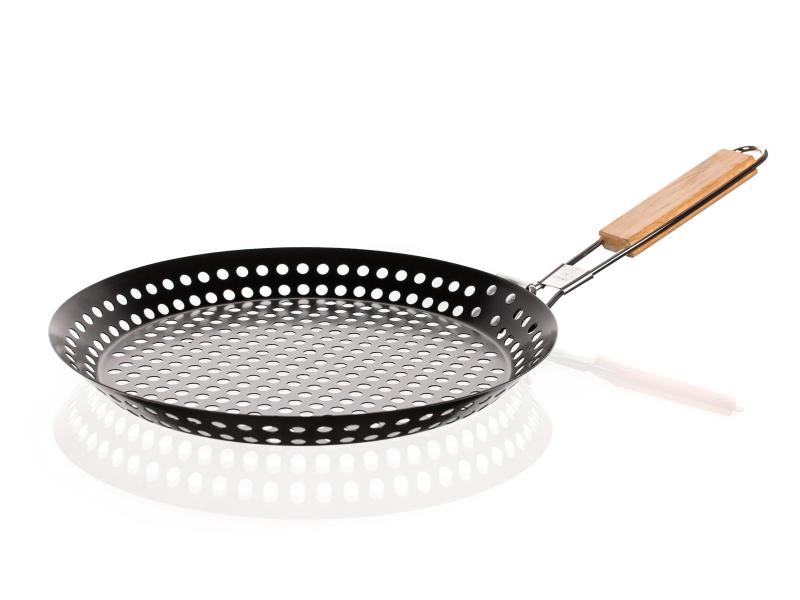 Grilovací pánev z ušlechtilé oceli s nepřilnavým povrchem a otvory pro rovnoměrné grilování masa, ryb i zeleniny. Praktická sklápěcí dřevěná rukojeť. Zobrazit celý popis
