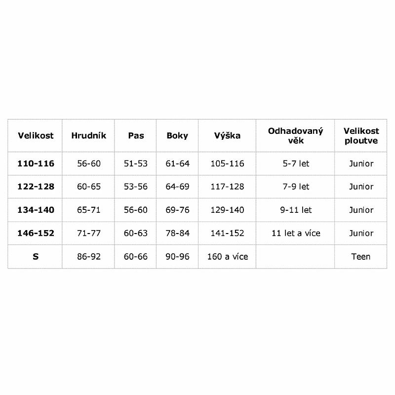 Monoploutve je možné pořídit ve dvou velikostech – JUNIOR a TEEN. Její velikost je závislá na velikosti kostýmu. Pro kostýmy v dětsých velikostech (110/116, 122/128, 134/140, 146/152) vyberte Monoploutev Happy Tails Junior, pro dospělé (velikost S) je vhodná Monoploutev Happy Tails Teen.