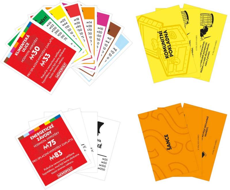 Obsah balení: hrací deska, 8 figurek, 28 karet – kupní smlouva, 16 karet – šance, 16 karet – pokladna, 1 balíček peněz Monopoly, 32 domů, 12 hotelů, 2 kostky, ukládací přihrádka a návod.