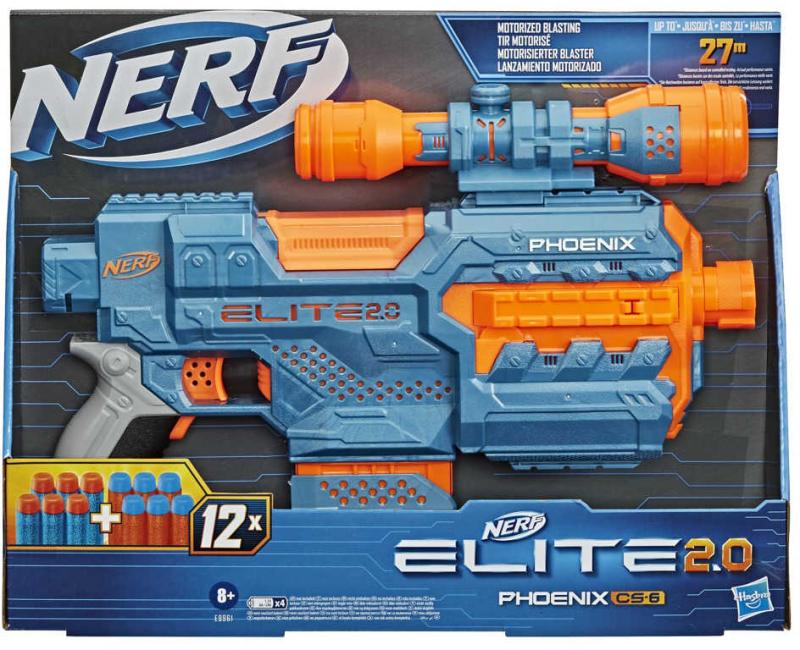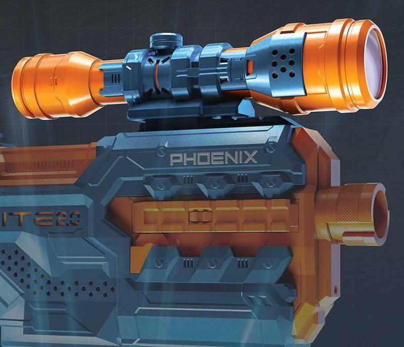 puškohledem, stisknout akcelerační spoušť a hurá do akce! Tento dokonale zpracovaný Nerf Elite Phoenix CS-6 vystřeluje šipky až do vzdálenosti 27 metrů. Skvělá modro-oranžová pistole nenechá