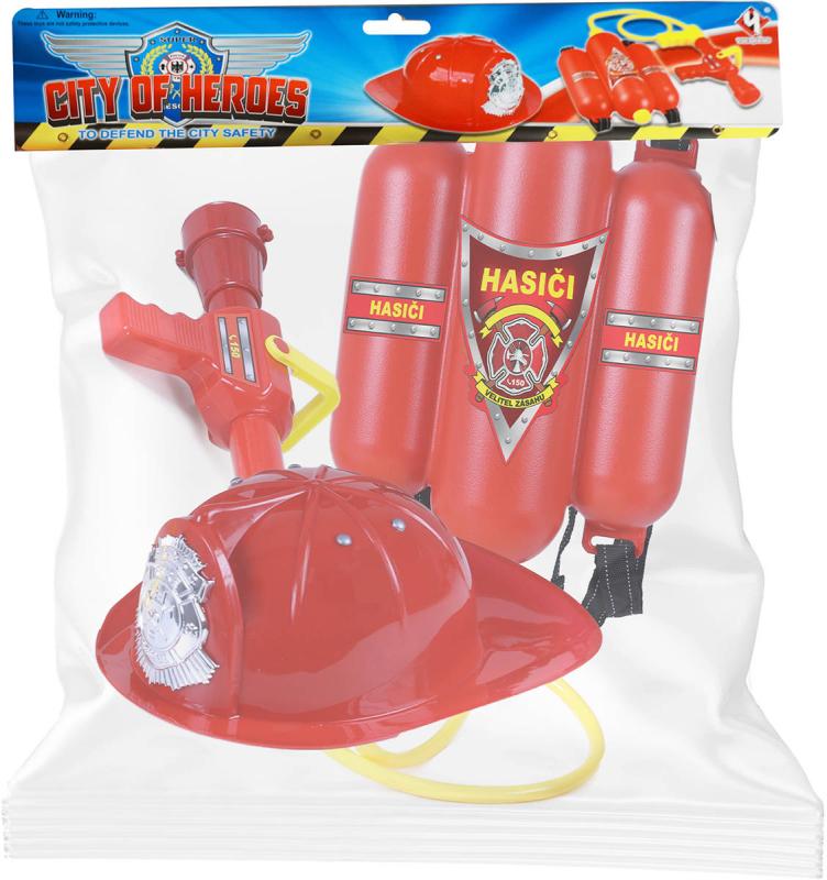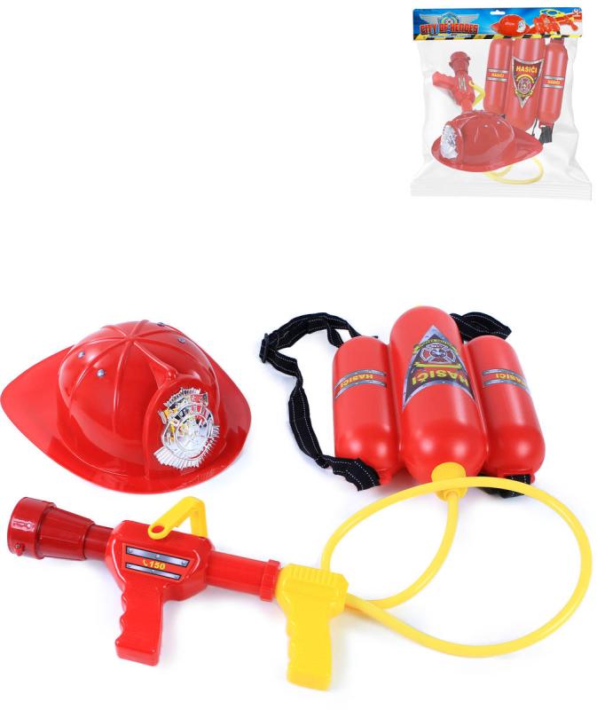 Plastový hasičský set pro děti. Součástí balení je ochranná helma na hlavu, hasicí přístroj s pistolí, s popruhem na záda. Helma s nastavitelným páskem. Baleno v sáčku.