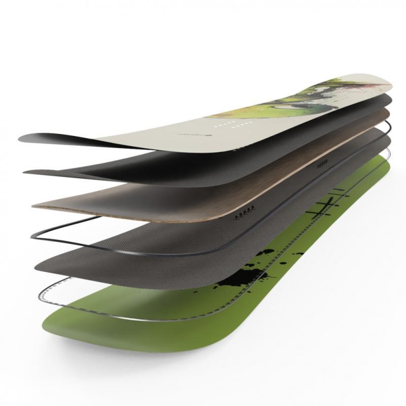 • Biax laminát - nejčastěji používaný způsob laminace dodává snowboardu kvalitní pop a lehkou torzní flex. Díky tomu prkno lehce zatáčí a užijete si s ním spoustu zábavy na sjezdovkách i ve snowparku.