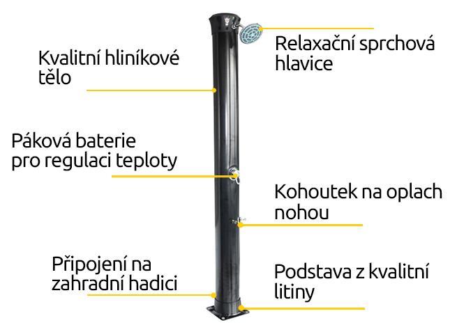 Ide o úplne ekologický spôsob, ako získať teplú úžitkovú vodu bez vynaloženia finančných prostriedkov na jej ohrev. Solárnu sprchu je možné využívať približne od apríla do septembra, pri priaznivom počasí samozrejme aj dlhšie. Odporúčame jej umiestnenie v takej časti záhrady, kam slnko svieti najväčšiu časť dňa a zároveň bude sprcha chránená pred vetrom – napríklad umiestnenie na slnečnom mieste pred živým plotom alebo múrikom. Tým znížite dobu potrebnú na ohrev vody. Jednoduchý, elegantný vzhľad tohto výrobku umožní veľmi dobre začleniť solárnu sprchu do Vášho exteriéru.