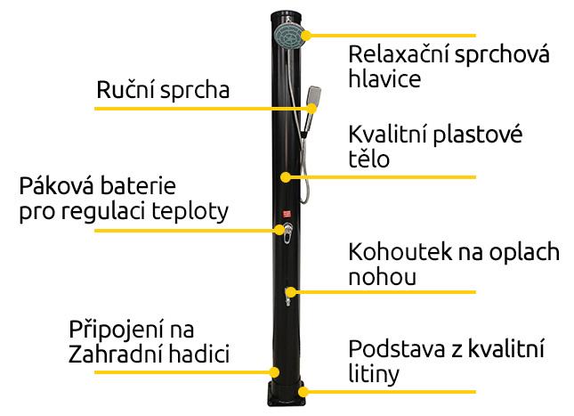 Solárna sprcha s ručnou sprchou je zariadením, ktoré Vám umožňuje ohrev vody v zásobníku za využitia solárneho ohrevu. Tento alternatívny ohrev so sebou neprináša žiadne finančné náklady. Samonosná konštrukcia sprchy slúži zároveň ako zberný zásobník vody a solárny kolektor, ktorý pôsobením slnečných lúčov vodu ohrieva. Teplotu vody si určíte sami vďaka pákovému kohútiku s reguláciou prívodu teplej/studenej vody.