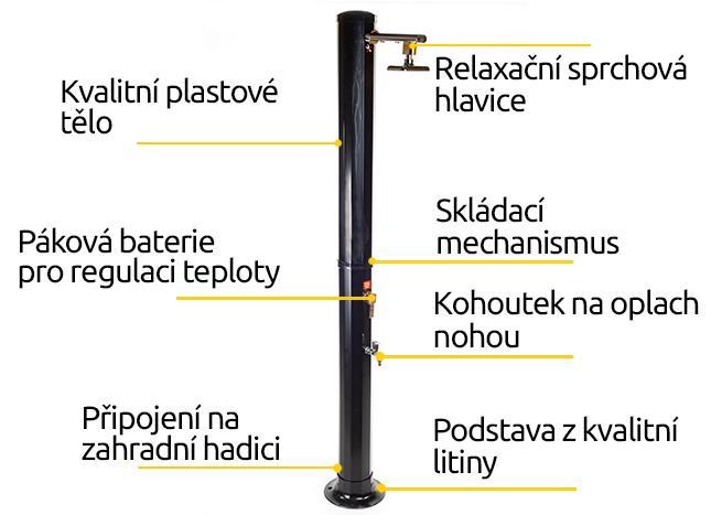 Skládací konstrukce sprchy šetří místo a zároveň prodlužuje její životnost. Díky pákovému kohoutku si můžete snadno regulovat teplotu vody podle potřeby. Sprcha funguje spolehlivě od dubna do září, případně i déle za příznivých podmínek. Pro rychlejší ohřev doporučujeme umístit sprchu na místo s dlouhým slunečním svitem, ideálně u živého plotu nebo domovní zdi, kde je zároveň chráněná před větrem.