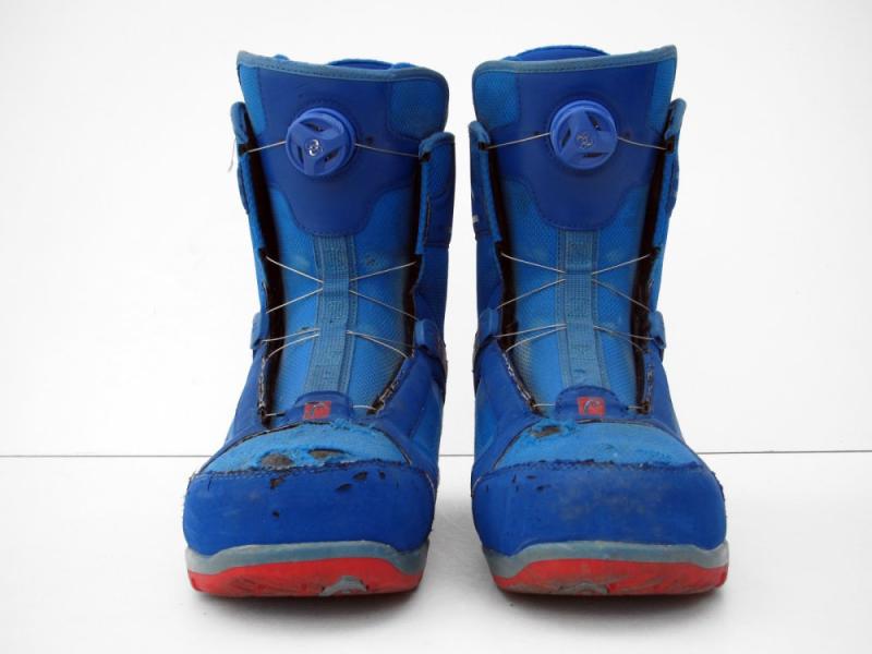 Modré snowboardové topánky s dĺžkou vnútornej stielky 290 mm, použité so známkami opotrebovania a poškodením látky na vonkajšej strane. Zobrazit celý popis