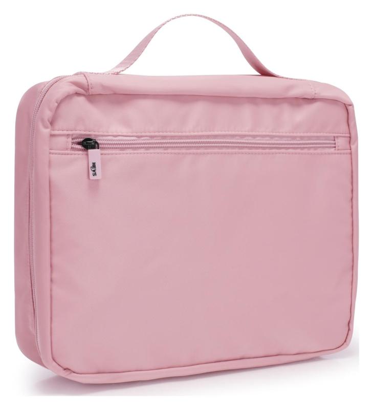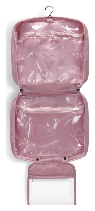 Prostorná, pastelově růžová cestovní toaletní taška na zip s vyjímatelným pouzdrem a integrovaným háčkem na zavěšení.integrovaný kovový háček na zavěšení v koupelně