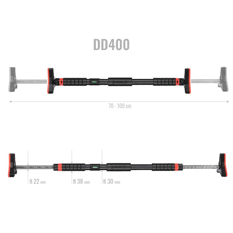 Po vytiahnutí hrazdy z balenia sa na jej konce nasadia koncovky. Hrazdu si na zemi roztiahneme tak, aby bola o niekoľko centimetrov kratšia, než je šírka zárubní a dotiahnutím čiernych matíc zabezpečíme dĺžku hrazdy. DD400 vložíme do zárubní, pomocou dodávanej vodováhy ju vyrovnáme a dotiahneme čierne matice. Hneď ako hrazda drží, tak si z koncoviek vytiahneme kľúč, ktorý si predĺžime pomocou nástavca a následne dotiahneme čierne matice tak, aby hrazda pevne držala. Nástavec a vodováhu si uschováme pre ďalšie použitie, kľúče zacvakneme späť do koncoviek a môžeme začať s tréningom.