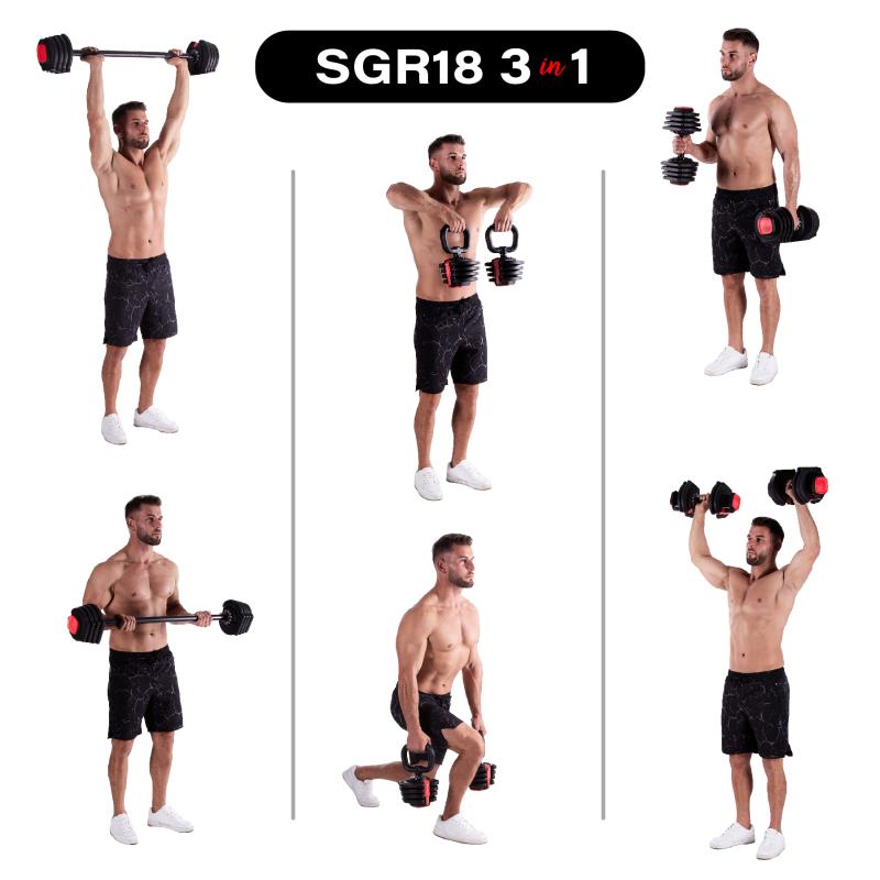 Činka SGR18 má ergonomický tvar a protiskluzovou rukojeť, která zajišťuje pohodlí a stabilitu. Činku lze sestavit jako jednoruční činku, obouruční činku, nebo jako kettlebell. Pro tento účel naleznete v balení prodlužovací díl (obouruční úchop) o délce 80 centimetrů, který lze zaměnit za jednoruční úchop a 2 tyče pro rozšížení základny. Dále jsou v balení 2 madla pro použití závaží jako kettlebell.
