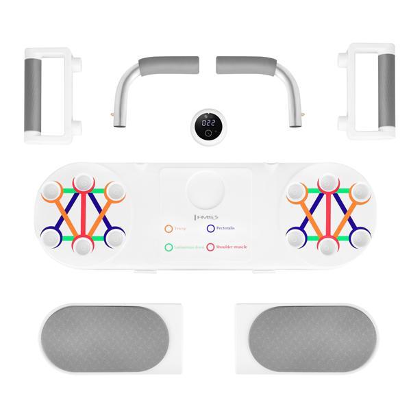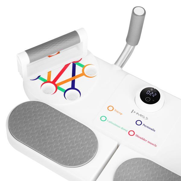 Tento multifunkčný prístroj je navrhnutý tak, aby umožnil efektívny tréning paží a brušných svalov priamo doma. Vďaka kombinácii stabilnej dosky pre plank, opôr na kľuky s niekoľkými nastaviteľnými pozíciami a integrovanému počítaču s optickým (IR) senzorom priblíženia, ktorý automaticky počíta opakovania, získate komplexný nástroj na posilňovanie.