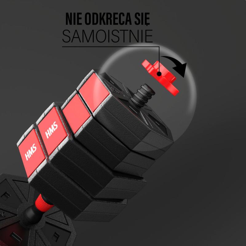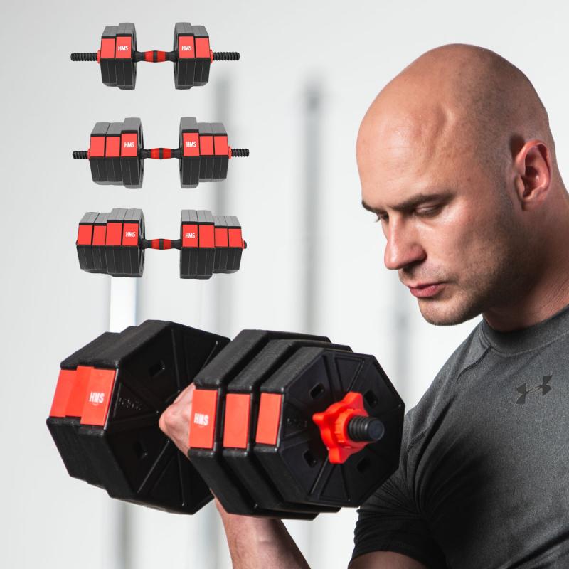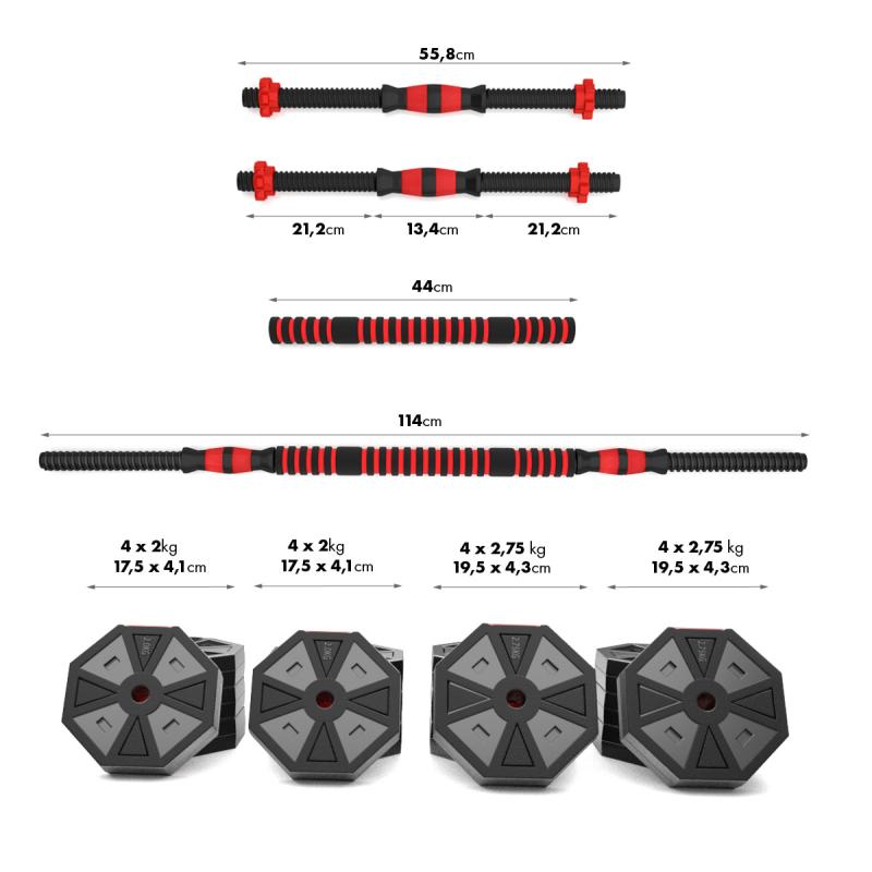 Kotúče sú vyrobené z tvrdého plastu, ktorý je vyplnený cementom. Obojručná os je spojovacím dielom, do ktorého sa zaskrutkujú hriadele jednoručných činiek. Nakladacie hroty sú opatrené závitom a závažia sa zabezpečuje pomocou hviezdicových matíc. Šesťhranný tvar kotúčov navyše zabraňuje ich odvaľovaniu. Činky sa vám tak nikam neodkotúľajú a budete ich mať vždy tam, kde ste ich odložili.