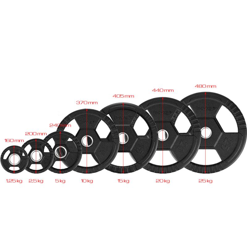 Vyrobený z ocele pokrytej tvrdou gumou, ktorá chráni ako tanier, tak podlahu pred poškodením. Navyše je vybavený praktickými madlami, ktoré uľahčujú manipuláciu s kotúčom pri nakladaní a vykladaní z osy, ale tiež sú ideálne na cviky so samostatným kotúčom.