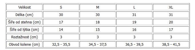| Obvod kolene (cm) | 32,5 - 35,5 | 34,5 - 37,5 | 36,5 - 39,5 | 38,5 - 41,5 |