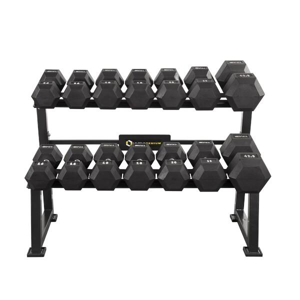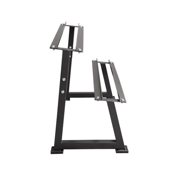 Stojan na jednoručné činky HMS Premium STR20 je ideálnym pomocníkom pre uloženie až 7 párov činiek. Kvalitná, oceľová konštrukcia je vyrobená z profilu 50 x 50 mm, vďaka čomu unesie zaťaženie až 500 kilogramov. Stojan STR20 má dve "koľajnice" s rozmerom 122 x 22 centimetrov, ktoré sú umiestnené nad sebou pre jednoduchú orientáciu medzi odkladacím náčiním. Štyri nohy stojana sú opatrené gumovými pätkami, ktoré chránia podlahu pred jej poškodením.