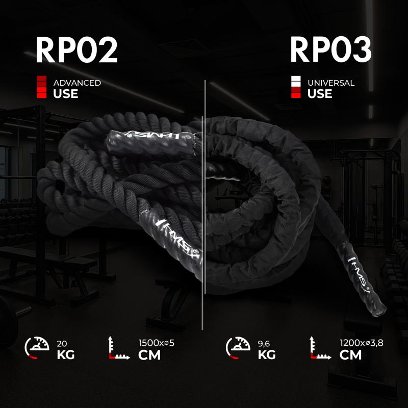 Lano RP02 je skvelou pomôckou k rozvoju sily, kondície, vytrvalosti a výbušnosti. Takzvaný Battel Rope je veľmi obľúbené medzi priaznivcami funkčného tréningu. Tiež je veľmi vhodným doplnkom pre posilnenie horných častí tela, najmä ramien a paží. Lano je veľmi efektívnou pomôckou pre tréning bojových športov. Na konci je vybavené ochrannými krytmi pre lepšie uchopenie. Posilňovacie lano HMS RP02 zlepšuje koordináciu, vytrvalosť a zmysel pre rovnováhu. Vďaka kvalitnému prevedeniu môžete lano využívať ako v telocvični, tak vonku.