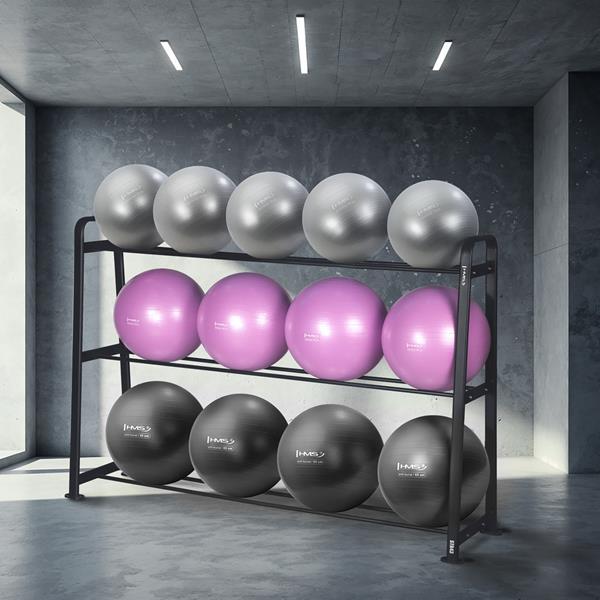 Stojan STR43 s tromi úrovňami uloženia umožňuje prehľadné rozdelenie lôpt podľa veľkosti a farby. Na spodnej polici sú uložené čierne lopty, uprostred fialové a na hornej polici grafitové, čo nielen uľahčuje prístup k vybaveniu, ale tiež dodáva tréningovému priestoru moderný a profesionálny vzhľad.