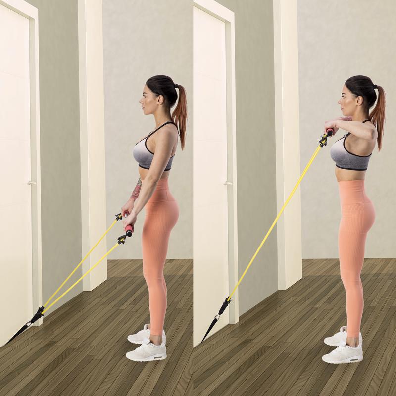 Jako příklad uvadíme cvik, kdy se na tyč postavíte a expadnéry přitahujete směrem k tělu. Případně si rukojeti expandérů nasadíme na chodidal a přitahujeme tyč.