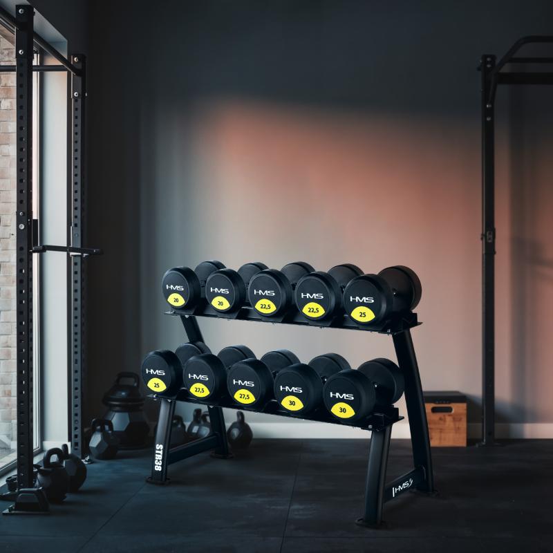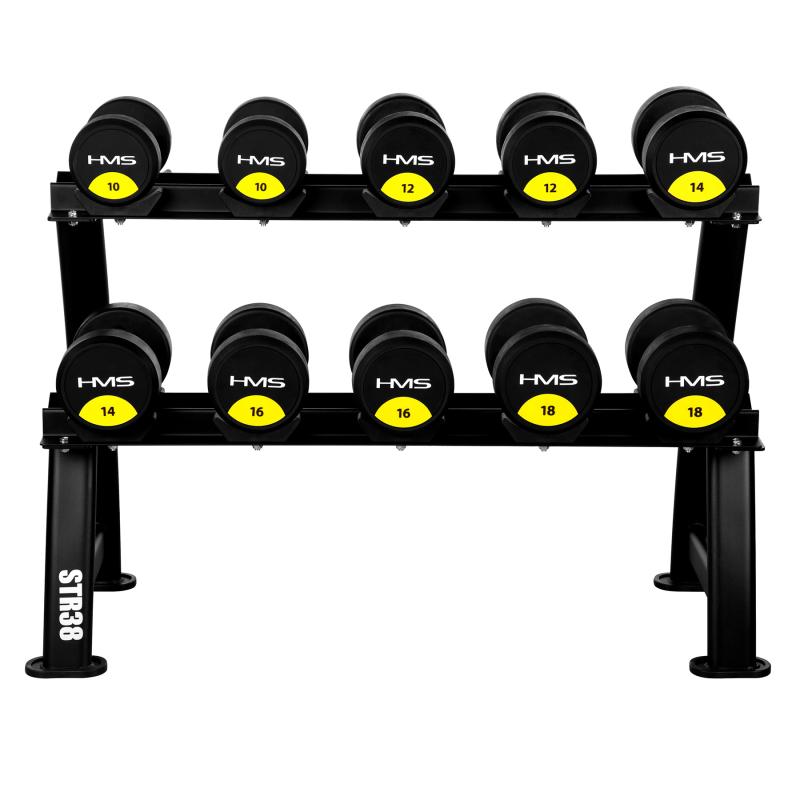 Stojan STR38 ponúka dve úrovne pre uloženie až 10 párov činiek. Vďaka mierne naklonenej ploche je úchop činiek pohodlný a nevyžaduje nadmerné ohnutie zápästia, čo znižuje záťaž kĺbov a zvyšuje pohodlie.