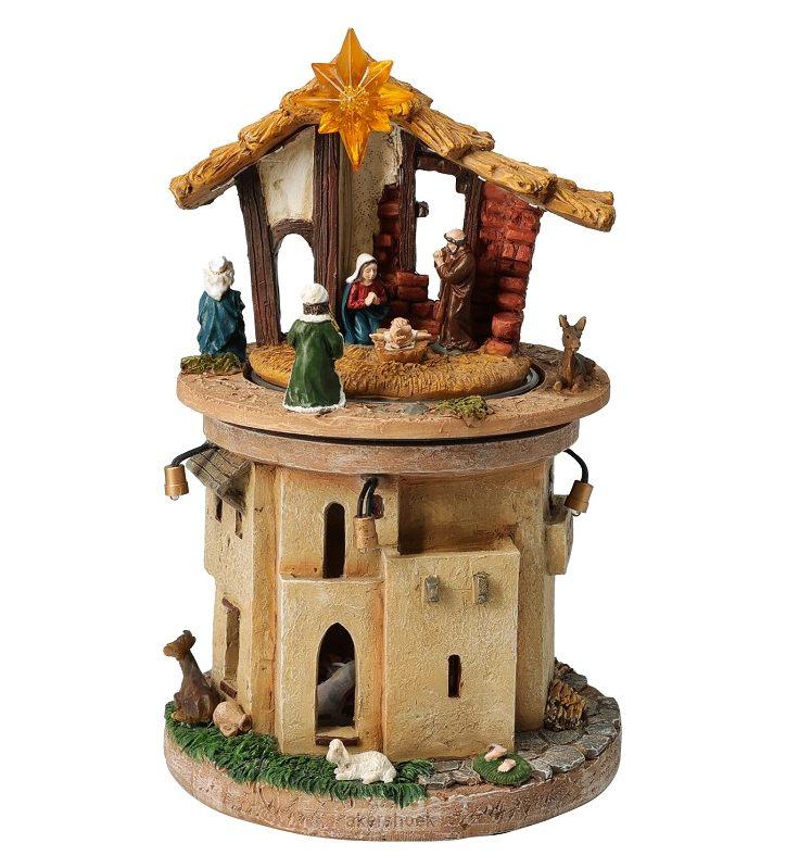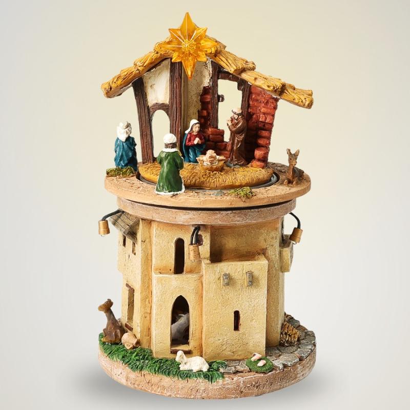 Betlém s LED světlem, hudbou a otočnou scénouInteraktivní betlém z polyresinu přináší kouzelnou atmosféru Vánoc díky LED osvětlení, hudbě a otočné kulisové scéně. Ideální jako dekorace na stůl nebo poličku, přináší radost dětem i dospělým.