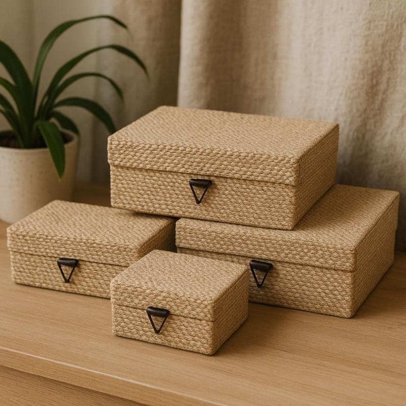 Praktická sada 4 úložných košíků s poutkem – stylové a univerzální řešení pro vaši domácnostUdržujte svůj domov přehledný a elegantní s touto sadou čtyř úložných košíků v různých velikostech. Jsou ideální pro organizaci drobností v koupelně, kuchyni, ložnici nebo kanceláři. Každý košík je vybaven praktickým poutkem pro uzavření.