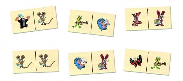 Hra Domino Krtek 28 dílků dřevo.Místo bodů jsou na herních kartičkách obrázky Krtečka a jeho kamarádů. Hráči se snaží vyložit všechny kartičky, které jsou ve hře. Přikládají je stejným obrázkem k sobě. Vyhrává ten, kdo se jako první zbaví všech kartiček. Díky použití veselých obrázků je hra vhodná i pro malé děti.