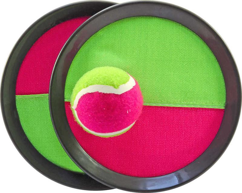 Oblíbená dětská hra Catchball - sada svou talířů s míčkem, v zeleno-růžovém provedení.Catch ball - to je zábavná venkovní hra pro 2 hráče, pro malé i velké, ideálně na zahradu nebo na pláž. Ke hře jsou potřeba vždy dva talíře a míček. Jeden hráč hodí míček a druhý jej chytá na terč. Míček se na terči zachytí pomocí suchého zipu. Skvělá hra na zdokonalení postřehu a vyplnění volných chvil. Oblíbená rekreační hra nejen na léto, vhodná na letní dovolenou, na chatu, atd.