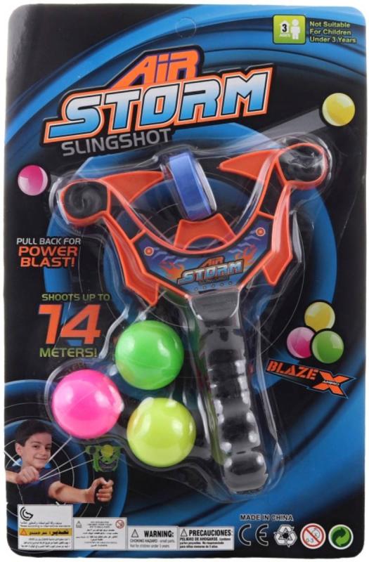 Kompaktní velikost s bezpečným designem a zábavou na cestách – vložte měkký míček, natáhněte, připravte se, zamiřte a vystřelte. Postavte si plechovky jako terče pro trénink přesnosti nebo střílejte proti zdi a užijte si odraz míčku zpět. Produkt je jedinečný a velmi lehký, vyrobený z kvalitních materiálů. Prak Air Storm je navržen pro použití se speciálními měkkými míčky, aby se zabránilo používání kamenů.