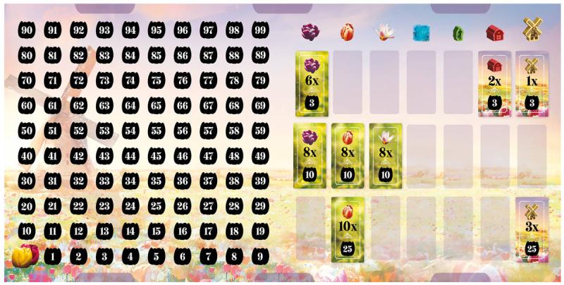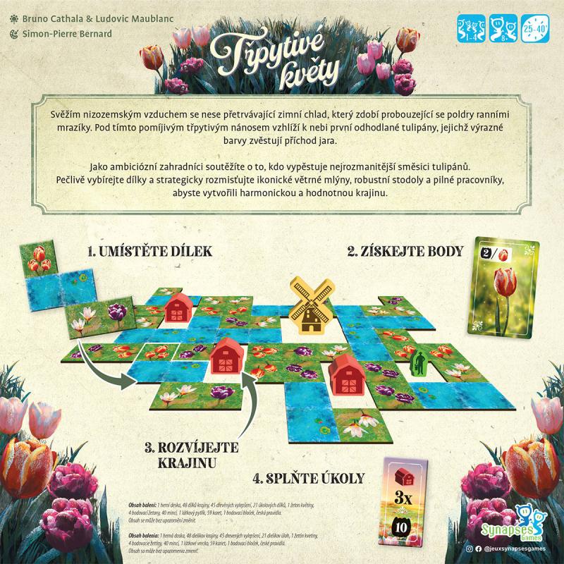 Svěžím nizozemským vzduchem se nese přetrvávající zimní chlad, který zdobí probouzející se poldry ranními mrazíky. Pod tímto pomíjivým třpytivým nánosem vzhlíží k nebi první odhodlané tulipány, jejichž výrazné barvy zvěstují příchod jara. Jako ambiciózní zahradníci soutěžíte o to, kdo vypěstuje nejrozmanitější směsici tulipánů. Pečlivě vybírejte dílky a strategicky rozmisťujte ikonické větrné mlýny, robustní stodoly a pilné pracovníky, abyste vytvořili harmonickou a hodnotnou krajinu.