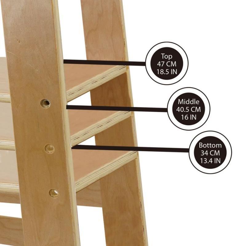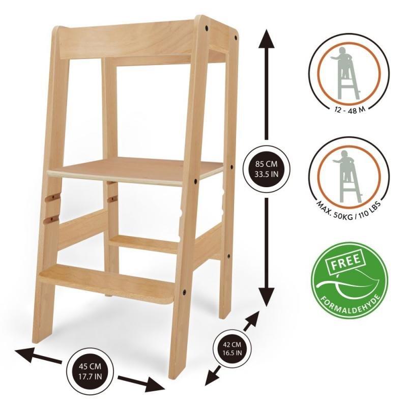 Učící věž vhodná pro děti od 18 do 48 měsíců. Nosnost 50 kg. Kvalitní přírodní překližka, neobsahuje formaldehyd. Nastavitelná výška horní plošiny – 34 cm, 40,5 cm a 47 cm. Zobrazit celý popis