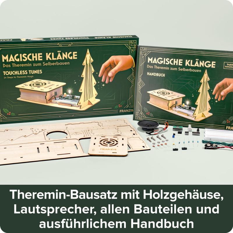 Sestavte si plně funkční theremin s anténou ve tvaru vánočního stromku, bez nutnosti pájení, krok za krokem podle přehledného návodu.Za 24 dvířky najdete všechny potřebné komponenty, včetně laserem řezané překližkové skříně s anténou ve tvaru vánočního stromku. Nástroj se sestavuje pomocí jednoduchého zásuvného systému, který nevyžaduje pájení. Dodává se také s předinstalovanou vánoční melodií.