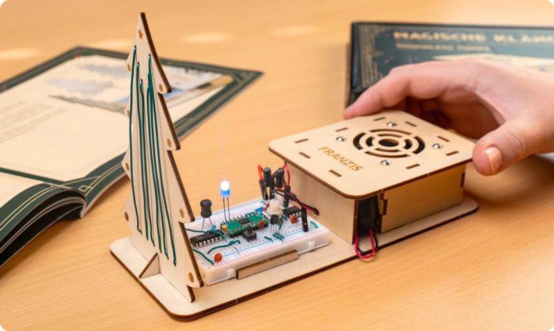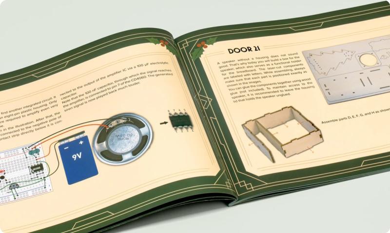 Za 24 dvířky najdete všechny potřebné komponenty, včetně laserem řezané překližkové skříně s anténou ve tvaru vánočního stromku. Nástroj se sestavuje pomocí jednoduchého zásuvného systému, který nevyžaduje pájení. Dodává se také s předinstalovanou vánoční melodií.