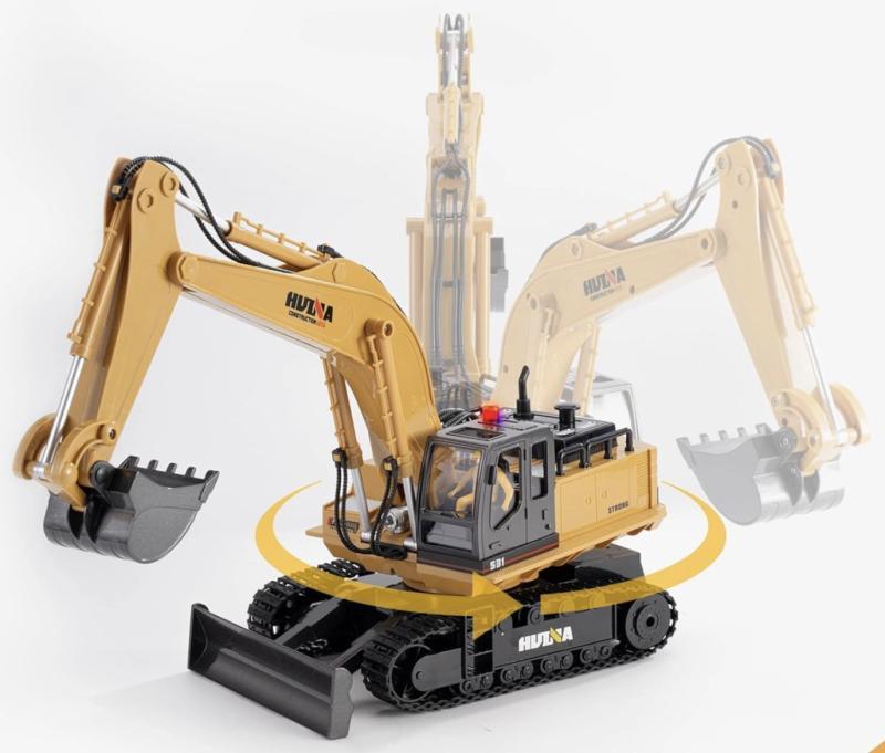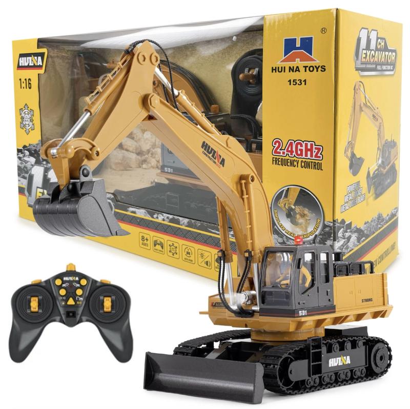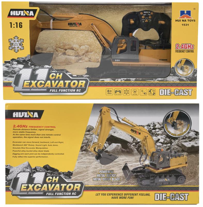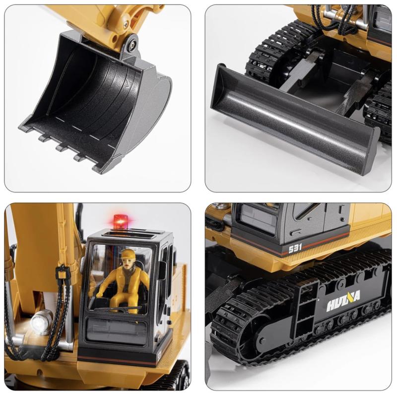 Huina RC pásový bager s radlicou a kovovou lyžicou 1:16 Nová verzia s majákom a figúrkou