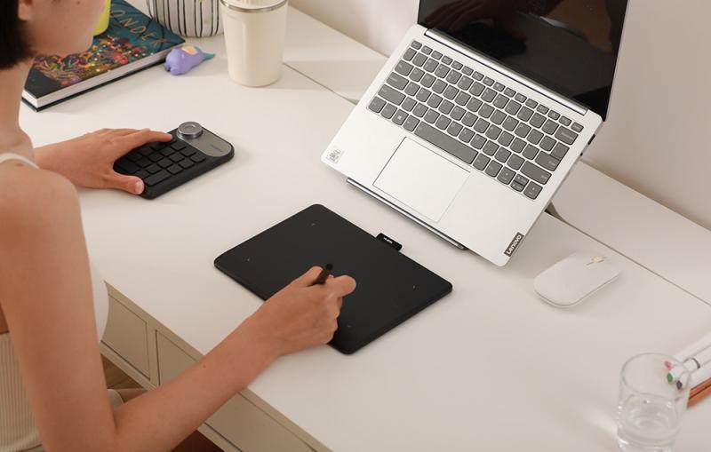 Povrch tabletu napodobuje texturu papíru a poskytuje přirozený zážitek z kreslení. Práce je tak přesnější a méně namáhá ruku. Mírně skloněné okraje a nižší opora pro zápěstí zajišťují, že se ruka neunaví ani při delším sezení, a díky symetrickému designu je tablet pohodlný pro praváky i leváky. Absence funkčních tlačítek na pouzdře umožňuje volně používat vlastní klávesnici a polohovat tablet tak, jak vám to vyhovuje - bez jakýchkoli omezení.