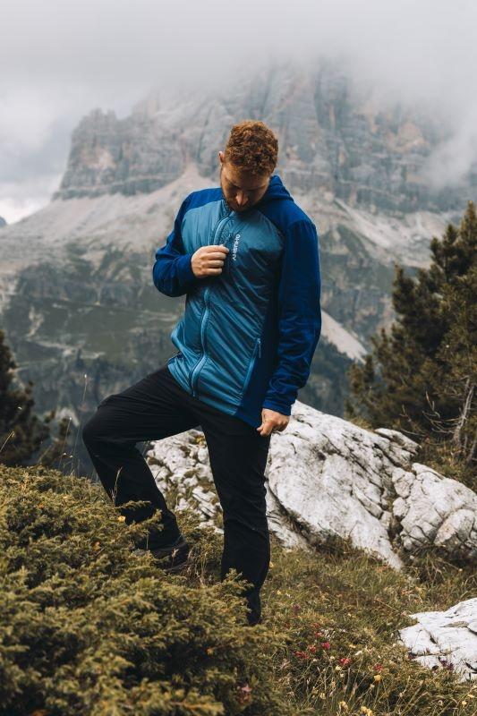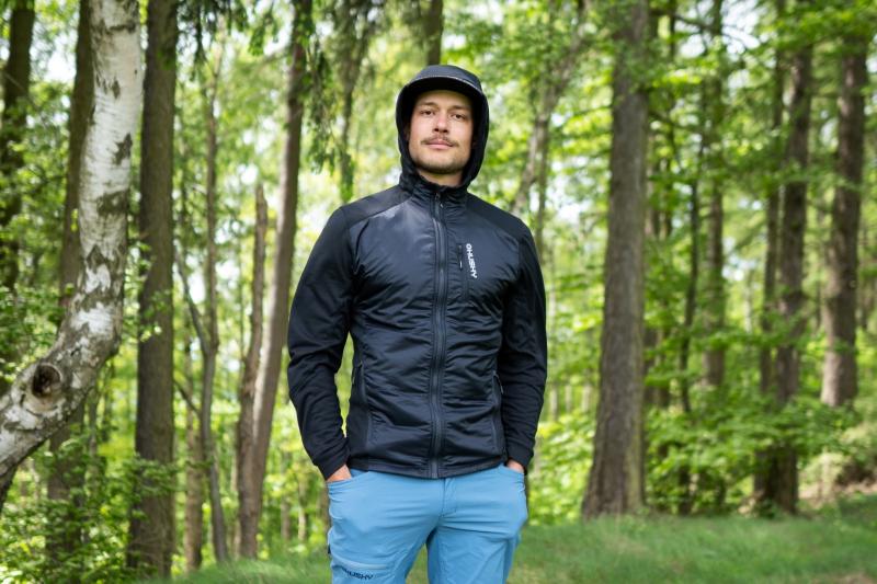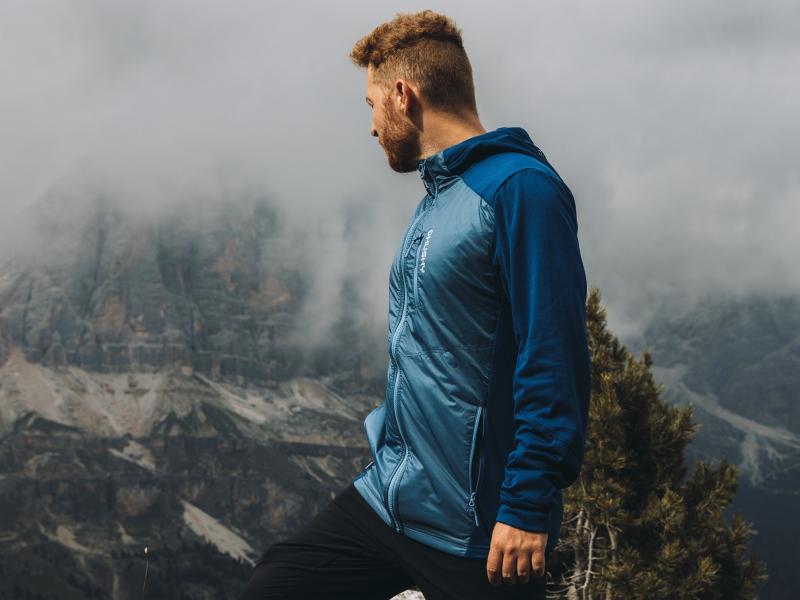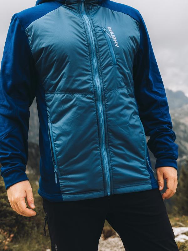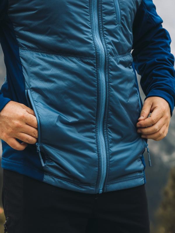 Mikina kombinuje vlastnosti klasické mikiny a bundy - přední a zadní díl obsahují tenkou vrstvu syntetické výplně, která zajišťuje efektivní tepelný komfort bez zbytečného objemu. Tato hybridní konstrukce je vhodná především pro outdoorové aktivity, kde je důležitá tepelná izolace a zároveň volnost pohybu.
