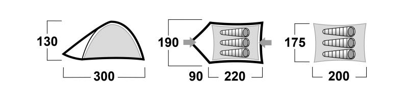 Rozměr vnějšího stanu 190 × 300 × 130 cm