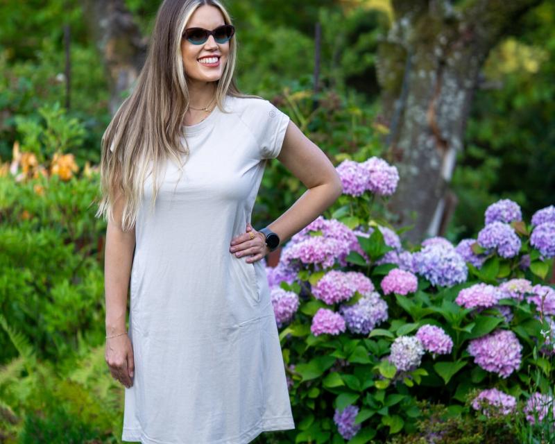 Šaty v minimalistickom dizajne, vyrobené z priedušnej bavlnenej zmesi, ktorá zabezpečuje komfort a odvod vlhkosti. Praktická kapsička a pohodlný strih podporujú všestranné využitie pri voľnočasových aj ľahkých outdoorových aktivitách.