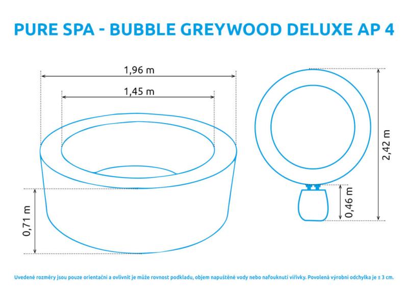 Vířivý bazén Pure Spa - Bubble Greywood Deluxe AP 4 disponuje novou funkcí WIFI pro spárování a ovládání vířivky pomocí mobilního telefonu. Dalším benefitem je systémem HWT na změkčování vody poskytuje dokonalou relaxaci. Díky jejím rozměrům je vhodná až pro čtyři osoby. Vířivka má 140 vysoce výkonných bublinkových trysek, které masáží povzbudí každý sval• Vana je vyrobena z vysoce kvalitního 3 vrstvého PVC. Disponuje konstrukcí 48 FIBER-TECH BEAMS (silná polyesterová vlákna).