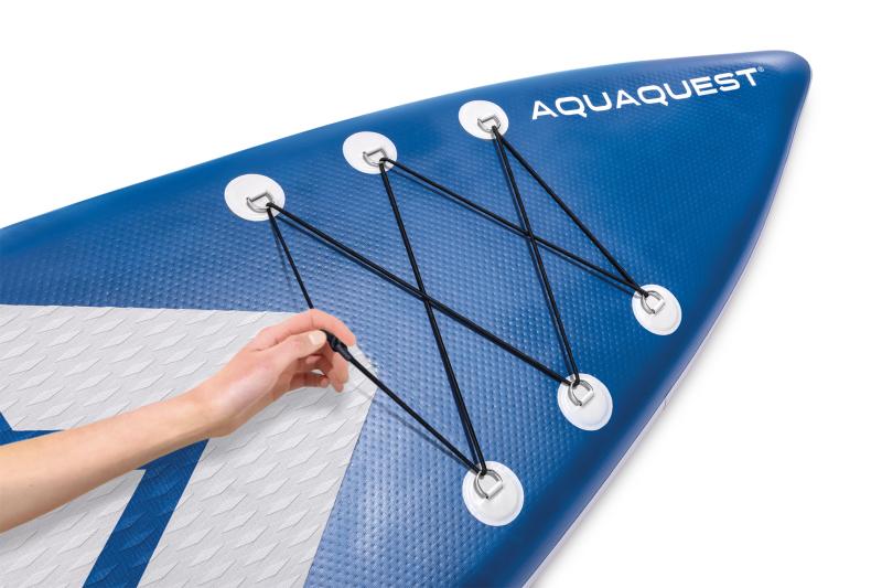Povrch prkna je pokryt protiskluzovou EVA podložkou s texturovanou strukturou, která minimalizuje riziko uklouznutí a zvyšuje bezpečí během pádlování. Bezpečnostní leash, který se připíná k noze a nerezovému D-kroužku, zabrání ztrátě paddleboardu při pádu do vody. Elastické bungee šňůry na palubě umožňují upevnit lehký náklad, který chcete mít po ruce. Pro snadný přenos slouží madlo na desce a elastický latexový batoh, do kterého paddleboard po vyfouknutí složíte a pohodlně přenesete na zádech.